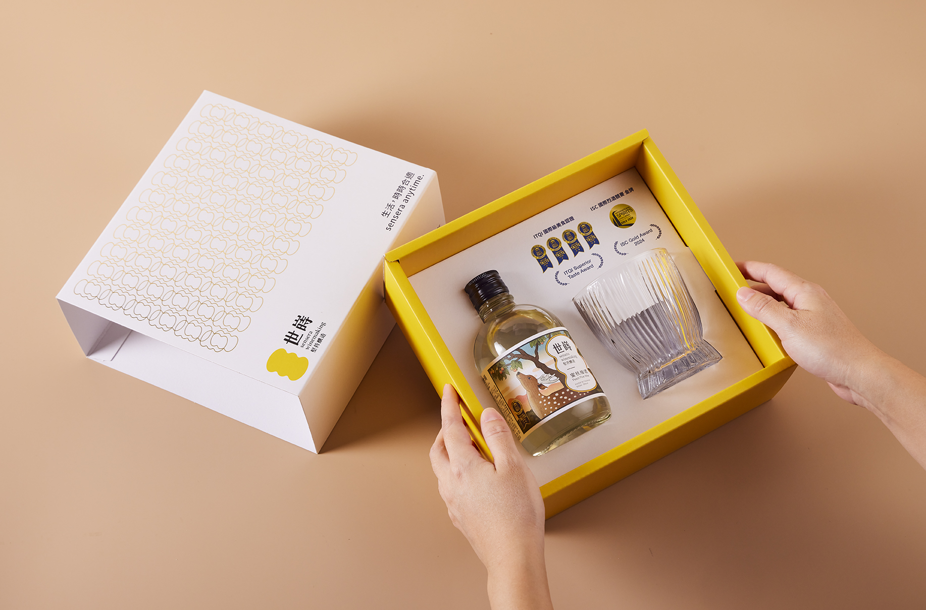 尺寸:面寬21.5cm X 面長22.5 cm X 厚8.8 cm 內容物:世嵵梅酒300ml 乙瓶 豎紋魚尾杯 乙只 附提袋
